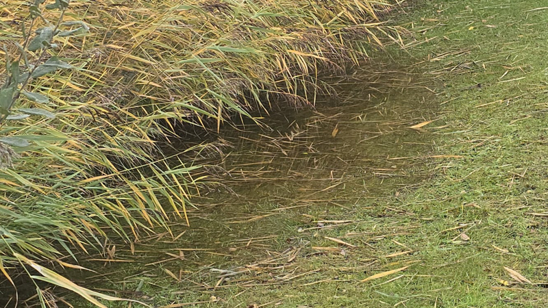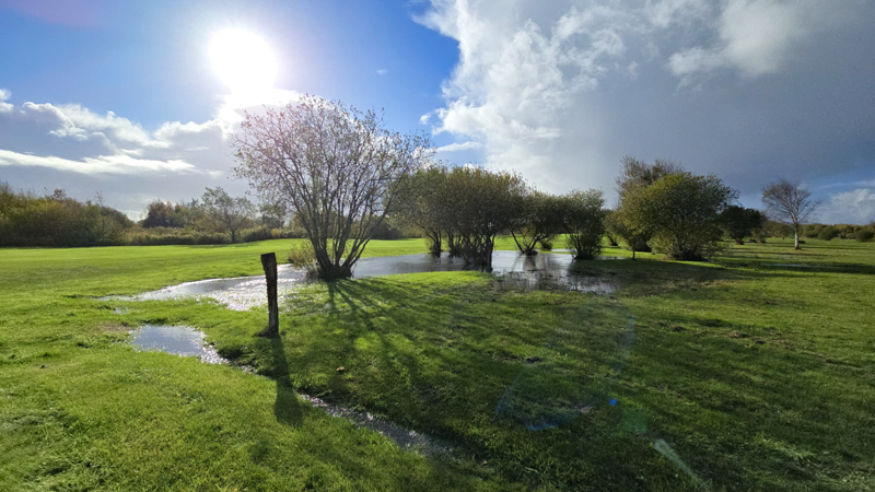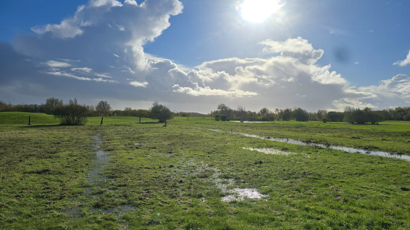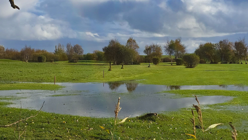Die Gräben, auch außerhalb des Golfplatztes, sind bis oben hin gefüllt. Unsere Teiche laufen über und erstrecken sich in das Semi Rough. Daher mussten wir den Platz bis auf weiteres leider sperren. Für die Bilder haben wir eine der rar gesäten Regenpausen genutzt.