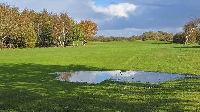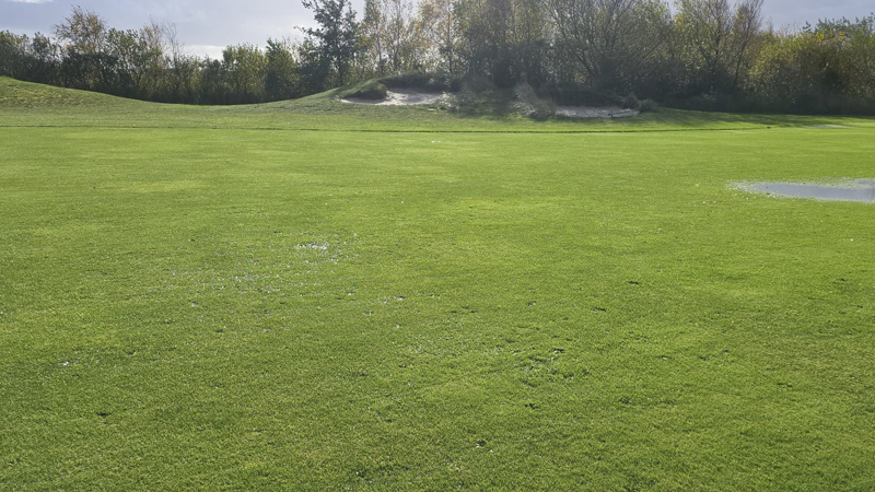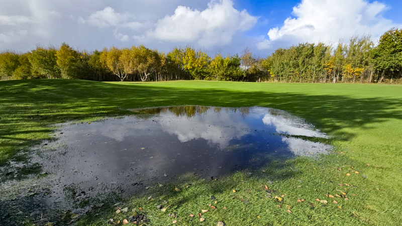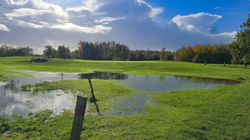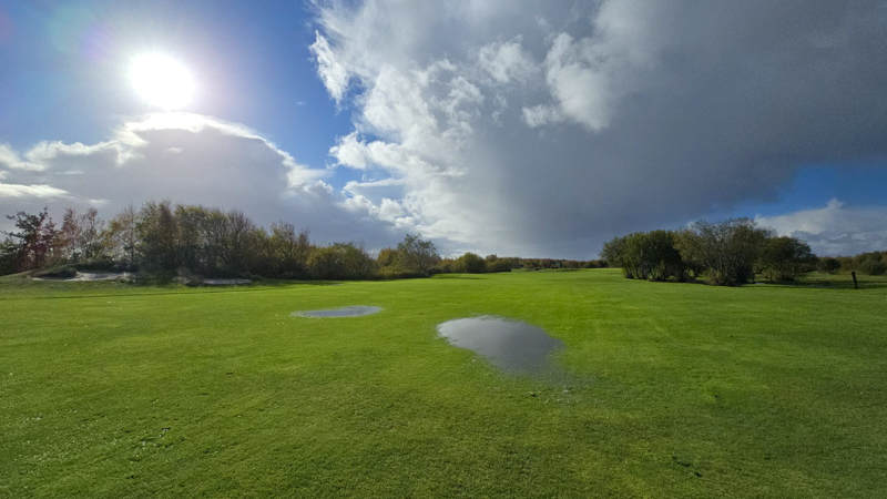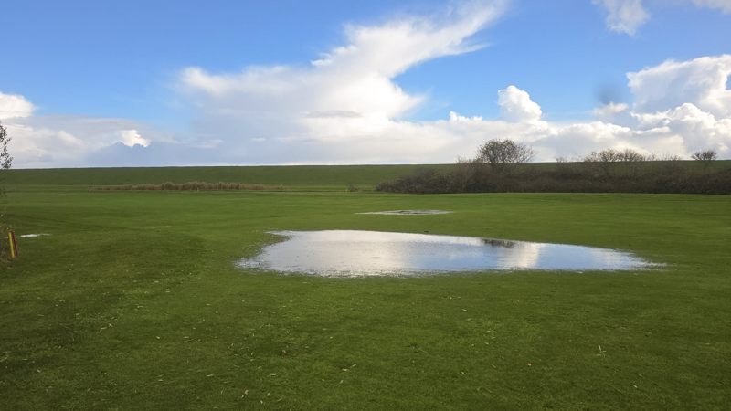 Auch wenn die Fairways von weitem noch sommerlich grün aussehen sind sie nicht zu betreten, geschwiege denn zu bespielen. Überall steht das Wasser, nicht nur in den weithin sichtbaren Pfützen. Ebenso ist auch das mähen derzeit unmöglich.
